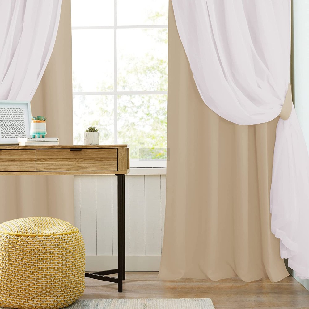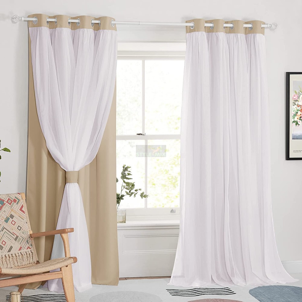 Нижняя часть шторы непрозрачная ткань - имитация льна, поверх шторы пришита легкая вуаль в складку.