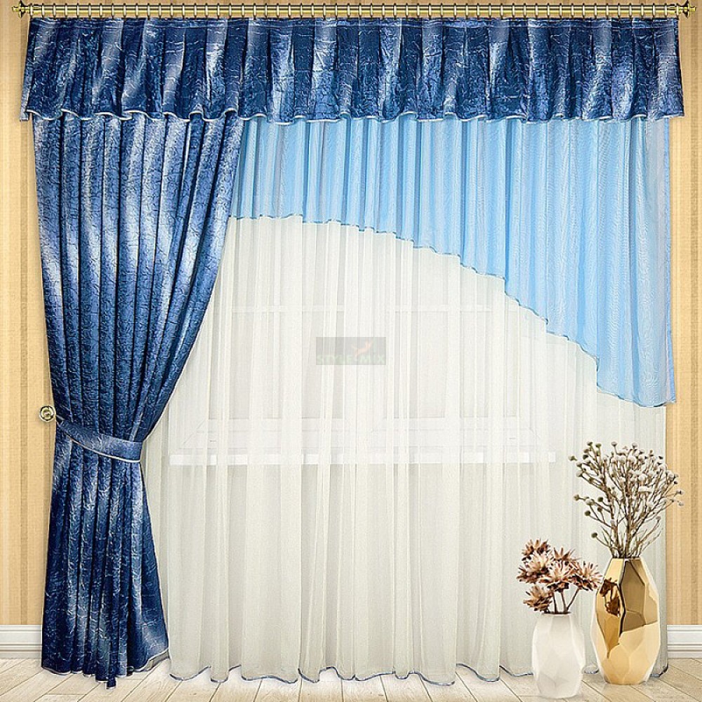 Комплект штор выполнен из ткани жатка. Тюль из белой и голубой вуали в виде арки пришиты на одну шторную ленту.