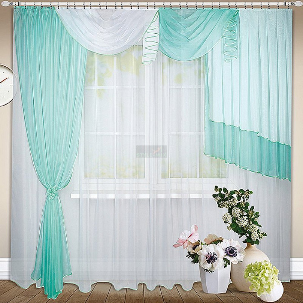 Дизайн данного комплекта способен удивить и восхитить любого. Это лёгкий классический тюль, длинная контрастная штора, которую можно зафиксировать красивым бантом, а также самая необычная его составляющая – креативный асимметричный ламбрекен.