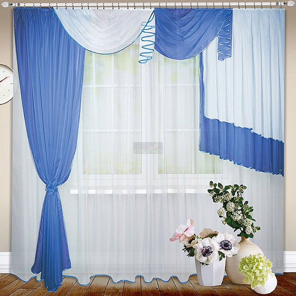 Дизайн данного комплекта способен удивить и восхитить любого. Это лёгкий классический тюль, длинная контрастная штора, которую можно зафиксировать красивым бантом, а также самая необычная его составляющая – креативный асимметричный ламбрекен.