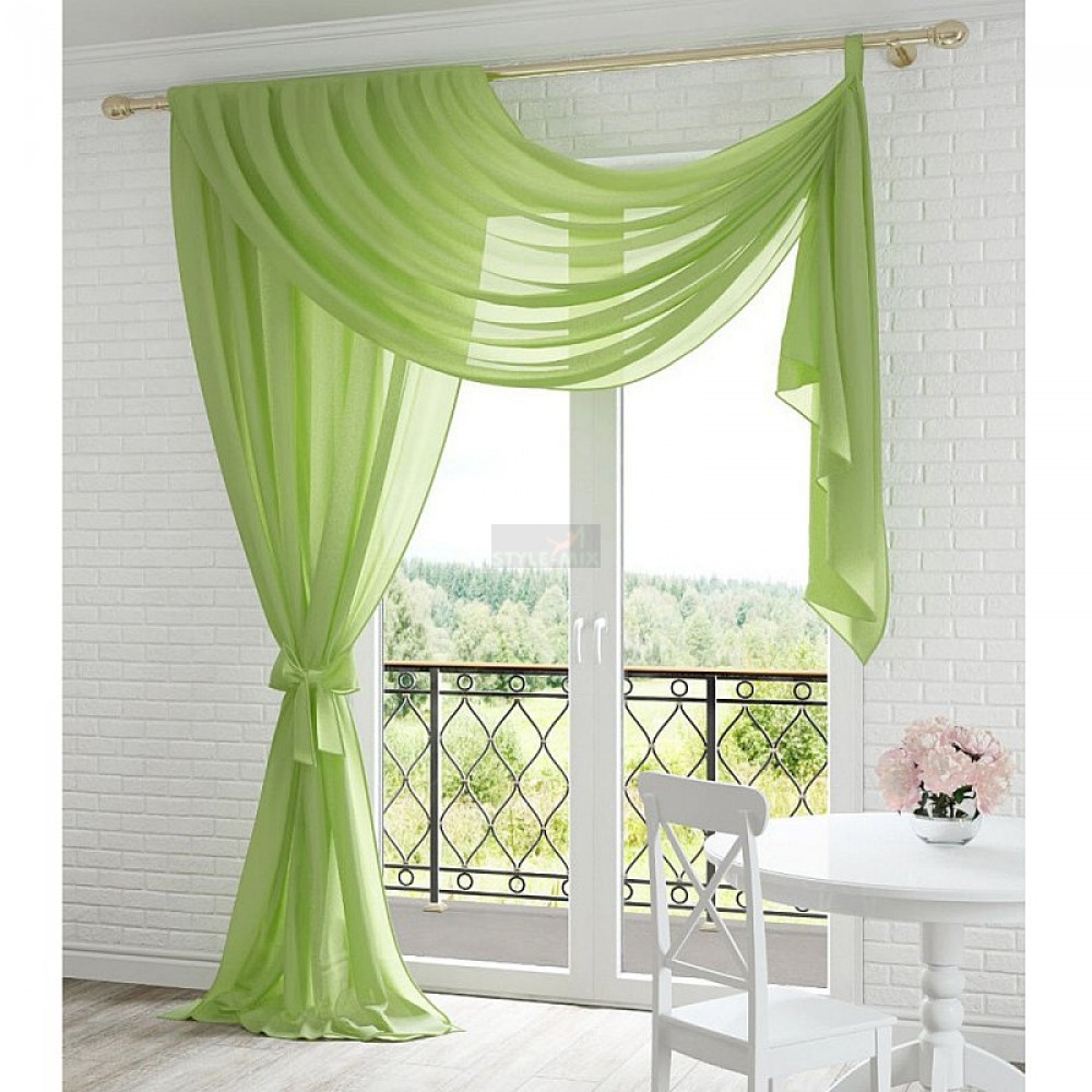Необычный комплект штор, состоящий из двух вуалевых полотен, которые соединены кулиской. Он дополнен прихватами и бантом позволяющими зафиксировать ниспадающую материю в разных комбинациях.