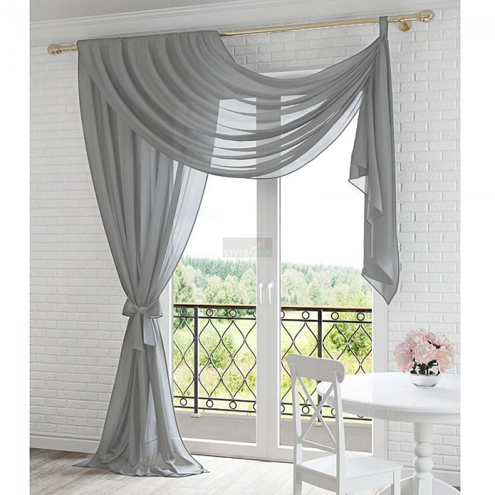 Необычный комплект штор, состоящий из двух вуалевых полотен, которые соединены кулиской. Он дополнен прихватами и бантом позволяющими зафиксировать ниспадающую материю в разных комбинациях.