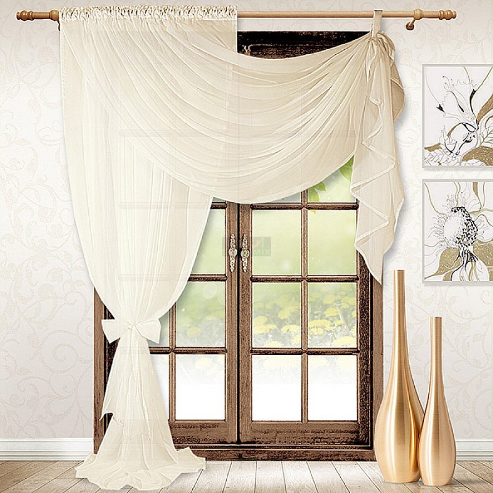 Необычный комплект штор, состоящий из двух вуалевых полотен, которые соединены кулиской. Он дополнен прихватами и бантом позволяющими зафиксировать ниспадающую материю в разных комбинациях.
