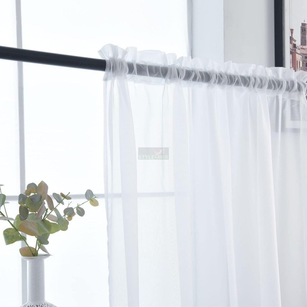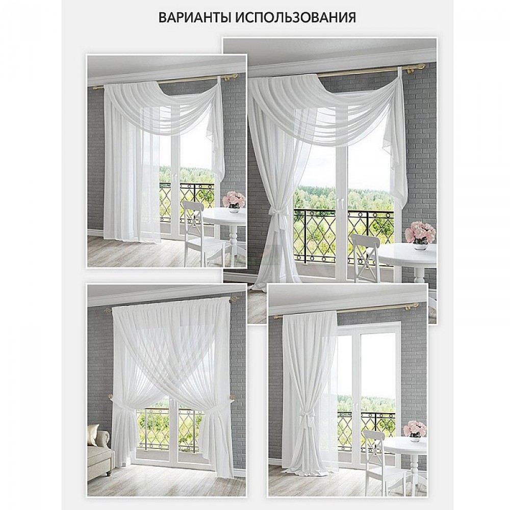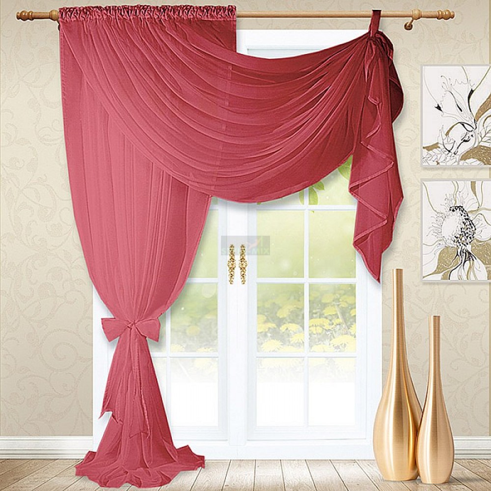 Необычный комплект штор, состоящий из двух вуалевых полотен, которые соединены кулиской. Он дополнен прихватами и бантом позволяющими зафиксировать ниспадающую материю в разных комбинациях.